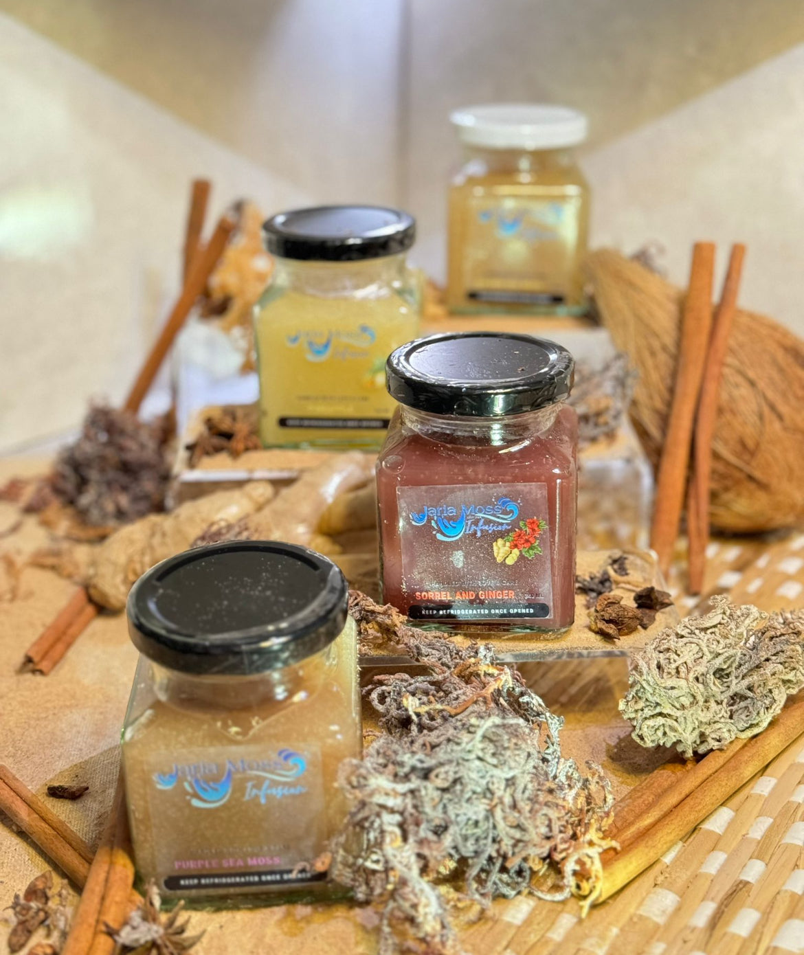 Our Purple and Gold Sea Moss Gel infused with ginger, cinnamon, lemons and agave nectar.