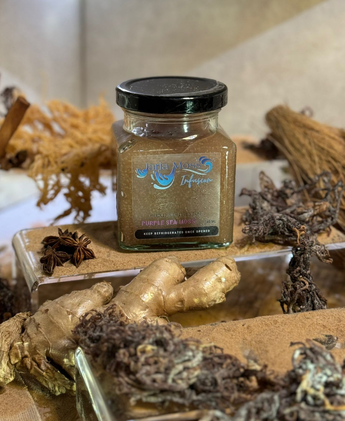 Purple Sea Moss infused with Lemon, Ginger, Cinnamon and Agave Nectar. The “Ital” option has no Agave Nectar added!!